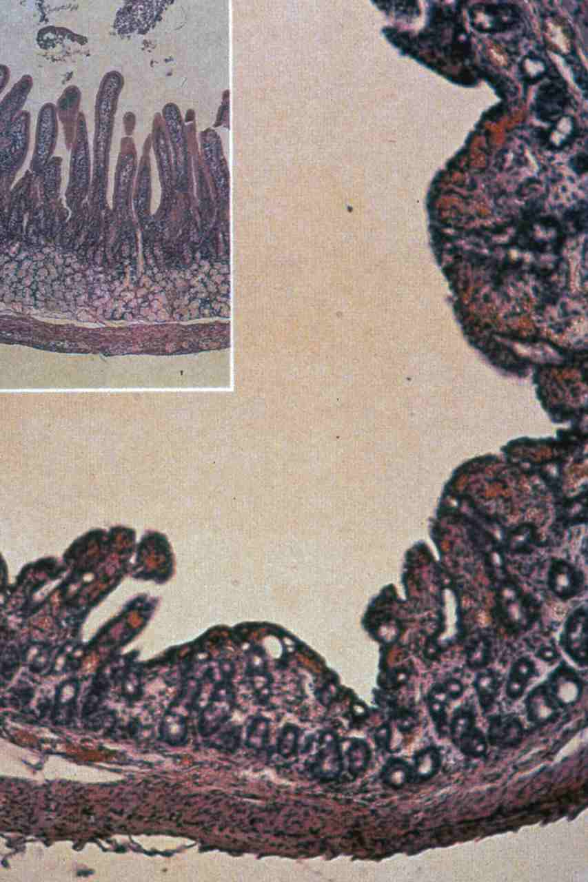 Dünndarmzottenatrophie nach Befall mit Corona- oder Rotaviren